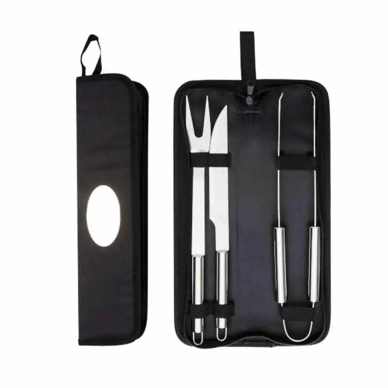 Kit churrasco 3 peças em estojo de nylon com alça. Possui: faca(acompanha proteção plástica), garfo(acompanha proteção plástica), pegador em inox e parte interna com velcro para guardar as peças. Acompanha plaqueta para gravação.