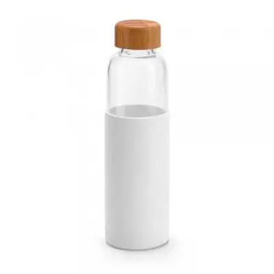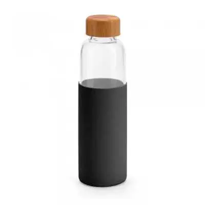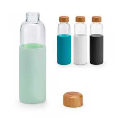 Squeeze em vidro 600 ml com tampa em bambu e revestida com luva em silicone.