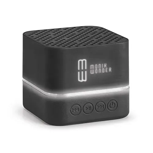 Caixa de som. ABS. Acabamento emborrachado. Luz LED no seu interior. Transmissão por bluetooth. Personalizável com logotipo iluminado. Autonomia: > 2h. Bateria: 300mAh. Inclui cabo USB – micro USB para carregamento. Fornecida em caixa. 59 x 59 x 51 mm