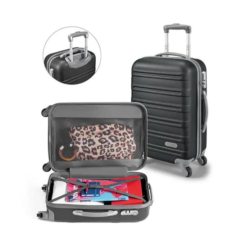 A Mala de viagem executivo personalizado é feita em ABS com interior forrado, com divisória. Fecho de segurança com senha na lateral, 4 rodas giratórias, pega extensível em alumínio, com mola (altura da pega estendida até 435 mm) e placa metálica removível, para fácil gravação. Mala com capacidade até 36 L e peso de 2,80 kg. 370 x 570 x 220 mm | Placa: 60 x 15 mm