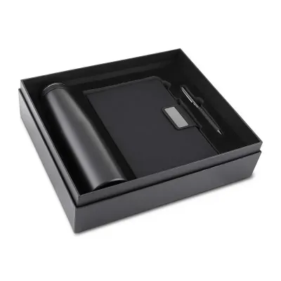 Conjunto composto por caderno em material RPET com fechamento magnético,com 100 páginas, caneta modelo twist com detalhe em tecido RPET preto e garrafa de parede dupla em inox (304 interno e 201 externo), com capacidade de 550ml. Acompanha caixa presenteável.