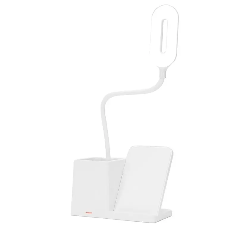 A luminária LED feita em plástico com base antideslizante e haste articulável, ela oferece três opções de luz com ajuste de intensidade: 10 LEDs em luz quente, 10 LEDs em luz fria e 20 LEDs com luz mista. Sua base inteligente possui uma área vertical para carregamento via indução, além de um prático porta-caneta, mantendo seu espaço organizado. Para garantir a iluminação e o carregamento, basta conectar o produto a uma fonte de energia, pois ele não armazena bateria. Acompanha cabo USB Tipo-C.