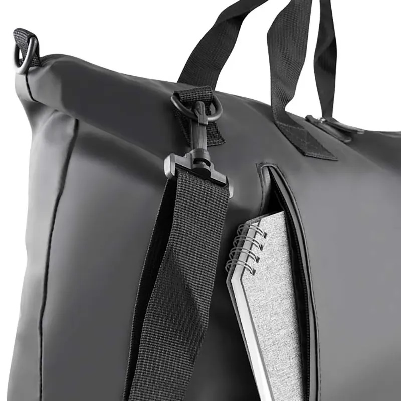 Mala esportiva em PU com revestimento interno em poliéster 210D. Possui faixa refletiva, bolso frontal com zíper, alça de mão e alça de ombro ajustável, além de dois compartimentos internos.