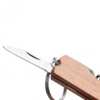 Chaveiro multifunções em madeira com abridor de garrafas, saca-rolhas e lâmina de corte.
