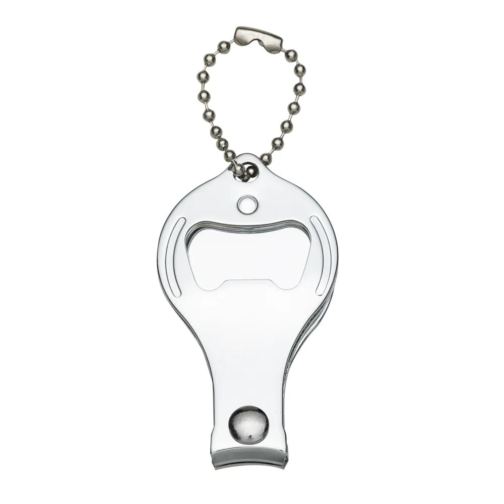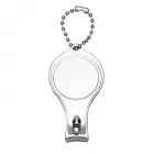 Chaveiro metal 3 em 1: abridor, cortador e lixa. Parte central circular ideal para gravações, detalhe de traços no contorno circular. Lado frontal com detalhes em relevo nas laterais e pequeno círculo acima do abridor. Para utilizar o cortador basta rotacionar a peça cirular e levantá-la. Acompanha correntinha.