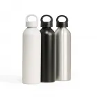 Garrafa de alumínio 630ml. Possui tampa plástica rosqueável com alça integrada.