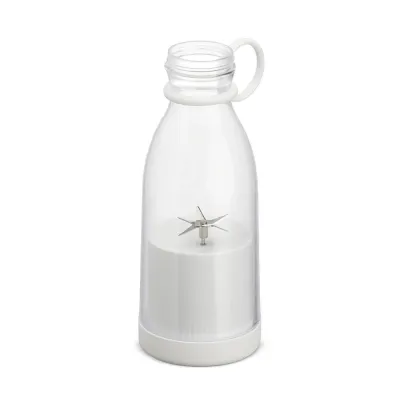 Mini liquidificador portátil com capacidade de 380ml. Contém tampa rosqueável plástica com alça emborrachada para transporte, ventoinha inox 6 lâminas e base plástica com borrachas antiderrapantes. Acompanha cabo USB. Obs. (Para o funcionamento do produto a quantidade total de frutas/água adicionadas não deve exceder 300ml).