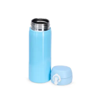 Garrafa 500ml em inox com botão e válvula para abertura. Possui um sistema de trava (basta mover para cima/baixo para abrir/fechar) pressione o botão central para abrir a tampa.