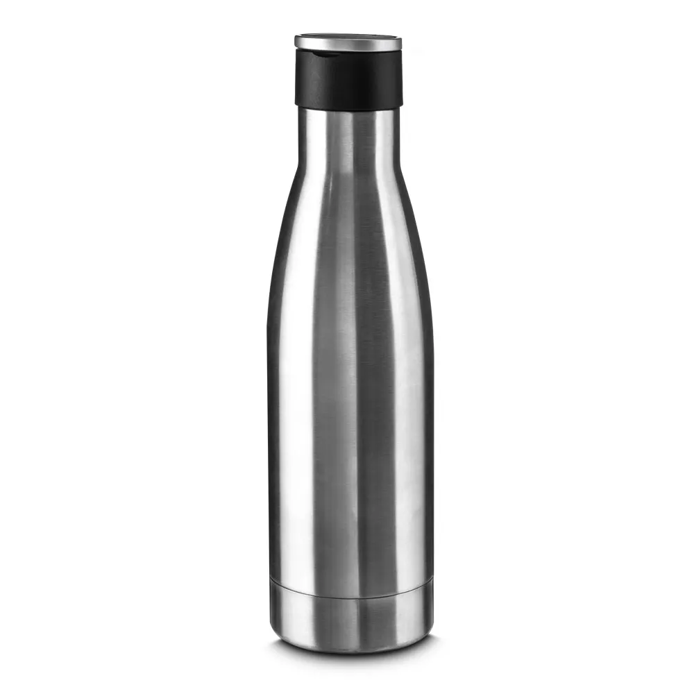 Garrafa térmica em aço inox isolada a vácuo com parede dupla, tampa de plástico com alça de transporte de aço inoxidável. Com capacidade de até 500ml. Dimensão do produto: 26,4xø6,9cm Peso do produto: 0,280kg Embalagem: Caixa de papelão branca Quant. por Caixa: 50 Dimensão Caixa: 78x39x5x28.5cm Peso da Caixa: 17Kg