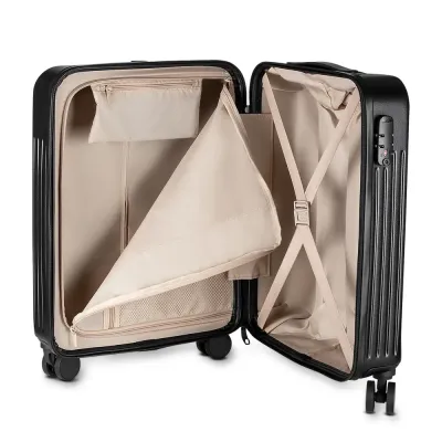 Mala de viagem em ABS Abertura frontal com ziper para acesso ao interior da mala; Saida USB ideal para carregamento de smartphones; Sistema de carrinho de aço; Alça de mão na parte superior  Quatro rodas de 360 graus; Acompanha Plaquinha de metal sem personalização. Mala perfurada para aplicação da plaquinha.