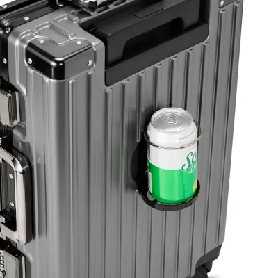 Mala de viagem 46 litros feita em plástico com acabamento em alumínio, contém cadeado numérico TSA. Compartimentos internos com bolso telado, bolso plástico para itens molhados e cinta compressora para roupas. A mala possui duas alças de mãos, puxador retrátil com regulagem de tamanho e suporte para celular, suporte porta bolsa, suporte para copo ou garrafa, quatro rodinhas 360º e apoios laterais.