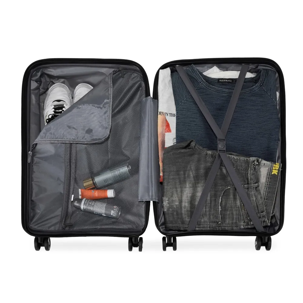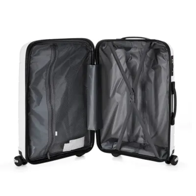 Mala de viagem 64 litros em plástico (casca dura), contém cadeado numérico TSA. Compartimentos com bolso telado e cinta compressora para roupas. A mala possui duas alças de mão, puxador retrátil com regulagem de tamanho, quatro rodinhas 360º e apoios laterais. Acompanha placa para personalização.