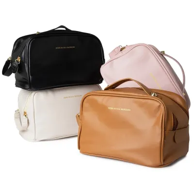 Estilosa e espaçosa, esta nécessaire se destaca com sua abertura diferenciada por zíper duplo. Feita de PU resistente à água, ela oferece um amplo espaço interno e divisórias de elástico para manter tudo organizado.