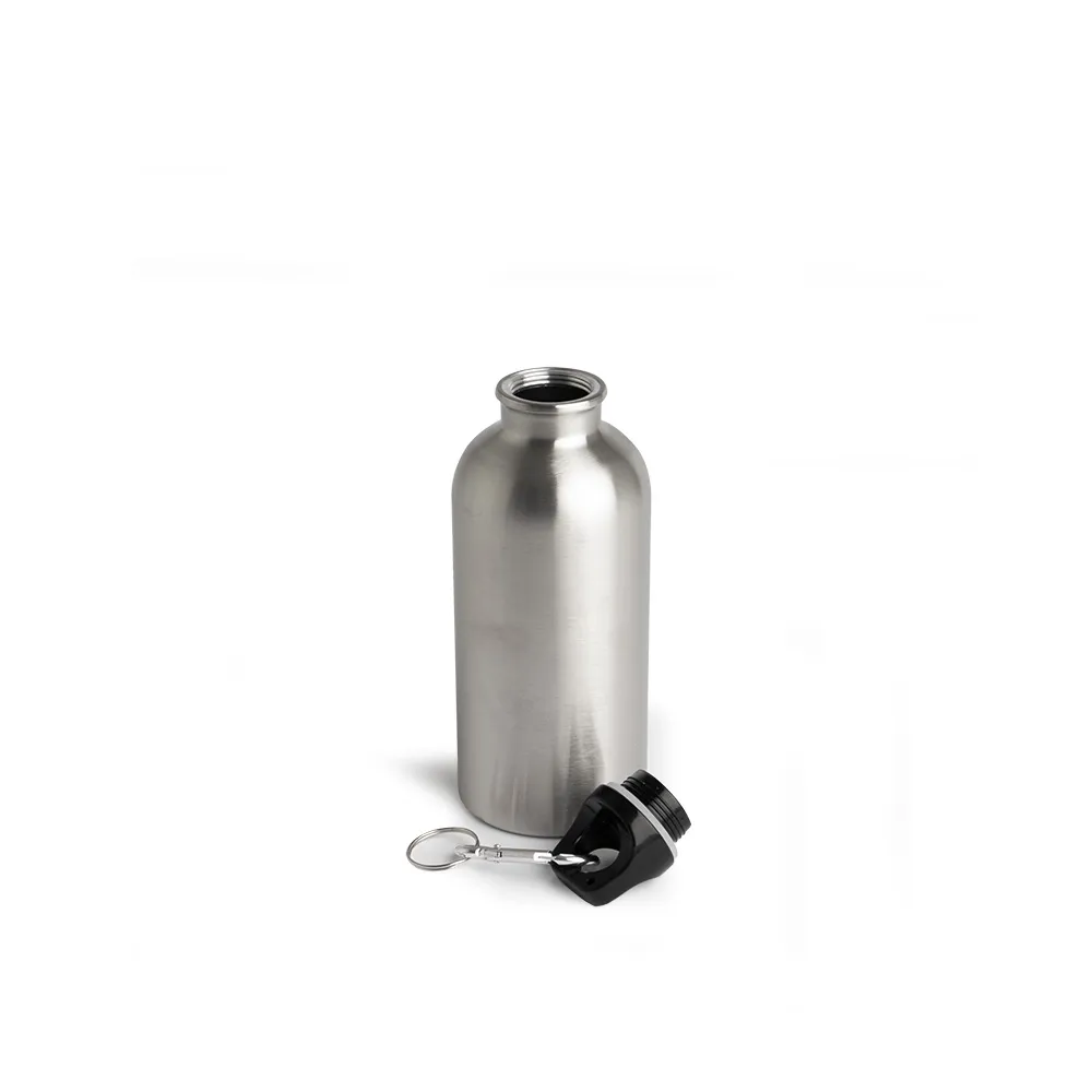 Squeeze inox com capacidade para 430ml. Possui tampa rosqueável com alça e acompanhada de um mosquetão.