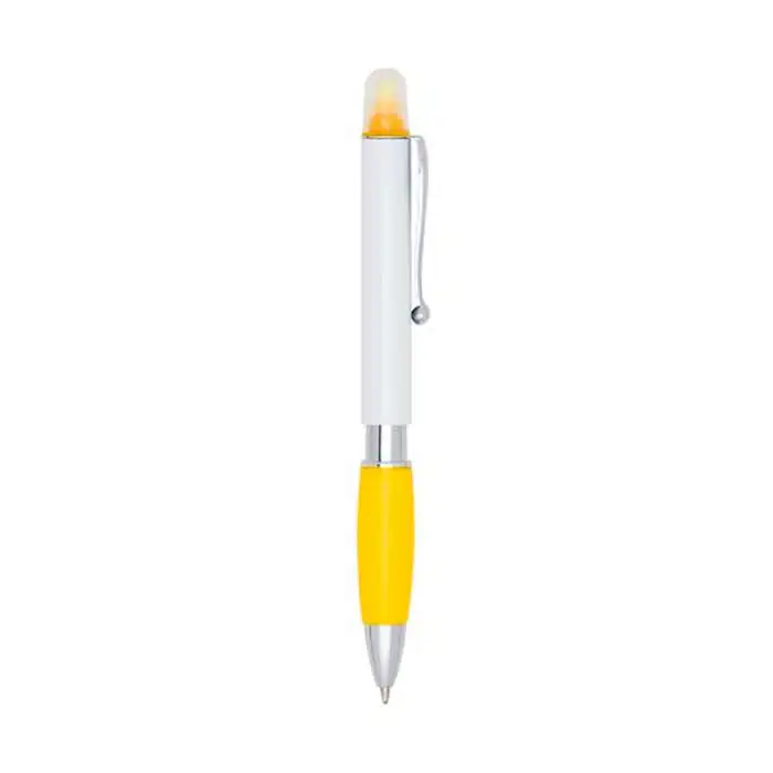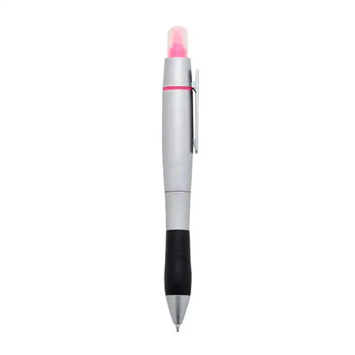 Caneta plástica marca texto. Possui clip de metal e marca texto com tampa protetora, design prata entre o corpo e o detalhe colorido inferior.