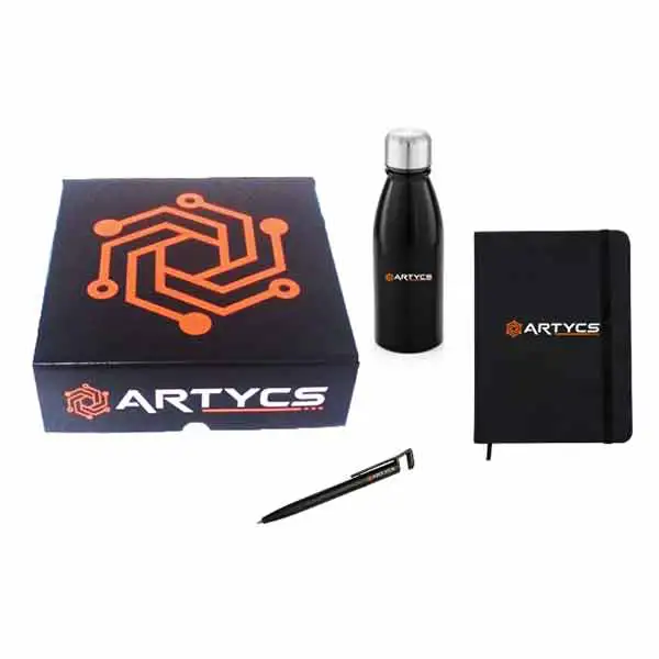 Kit Boas vindas em caixa de papelão com tampa acoplada personalizada com adesivo, contendo: