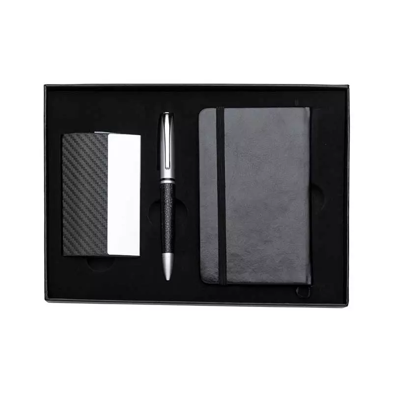 Kit executivo com 3 peças em estojo de papelão rígido com tampa e parte interna revestida de espuma. Contém: porta cartão de couro sintético texturizado, com detalhes prata brilhante, caneta metal fosca com detalhe emborrachado preto, caderneta em couro sintético com aproximadamente 80 folhas amarelas pautadas. Caixa acompanha placa metálica para gravação. Personalização no porta cartão, caneta e placa da caixa à Laser. Personalização na caderneta em Silkscreen.