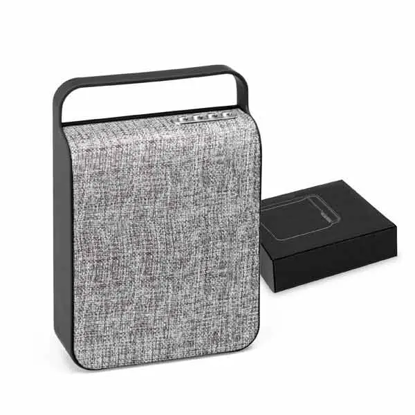 Caixa de som com microfone. ABS e tecido em poliéster. Acabamento emborrachado. Com transmissão por bluetooth, ligação stereo 3,5 mm e leitor de cartões TF. Com 2 x 3W/4O. Autonomia até 3 h. Função para atender chamadas, controle de volume, conexão à playlist do dispositivo móvel e rádio FM. Incluso cabo USB para carregar. Fornecida em caixa presente. 155 x 230 x 55 mm | Caixa: 170 x 260 x 70 mm.
