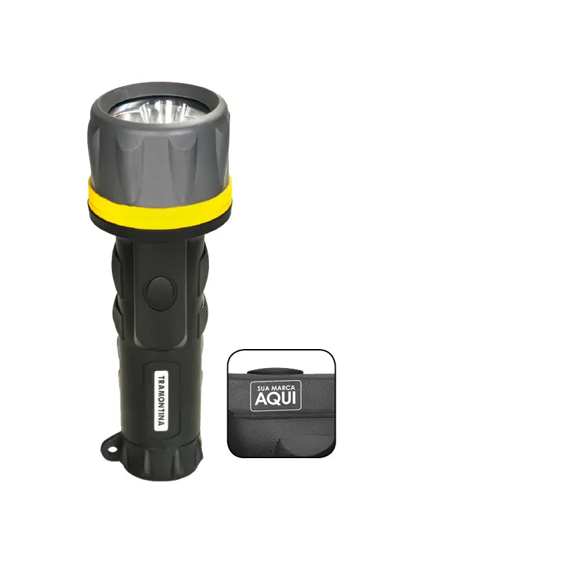 Lanterna Tramontina em plástico recoberta em borracha. Opção de personalizar com sua marca em tampografia no corpo do produto.