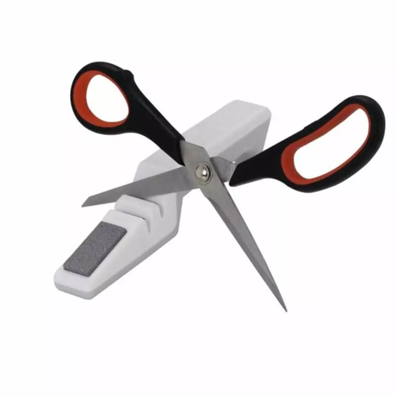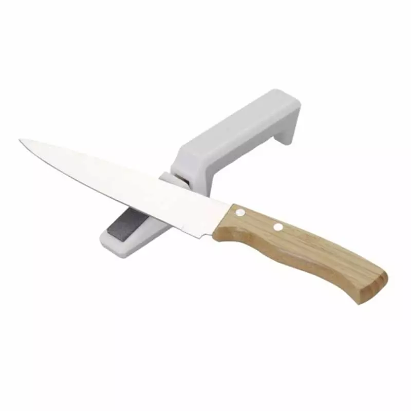Afiador de facas e tesouras com pedra para acabamento, contém detalhe vazado na área traseira acesso de gancho.