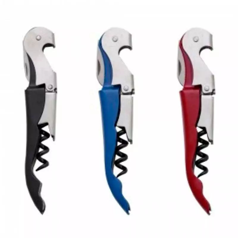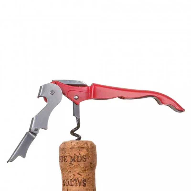 Saca rolhas metálico com lâmina de corte e abridor de garrafa.