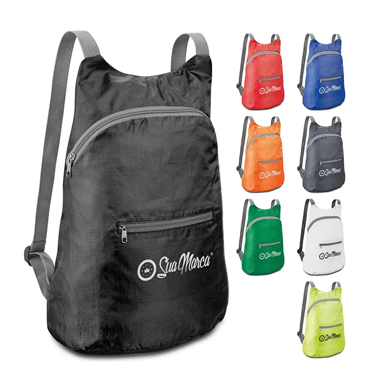 Mochila dobrável personalizada em 210D ripstop, ideal para viagens e uso diário. Conta com um bolso frontal para maior praticidade e organização. Sua capacidade é de até 8 litros, oferecendo espaço suficiente para seus itens essenciais. Feita com material resistente, garante durabilidade e conforto no transporte. Compacta e leve, pode ser dobrada e armazenada de forma prática quando não estiver em uso. Perfeita para quem busca uma mochila funcional e de fácil transporte.