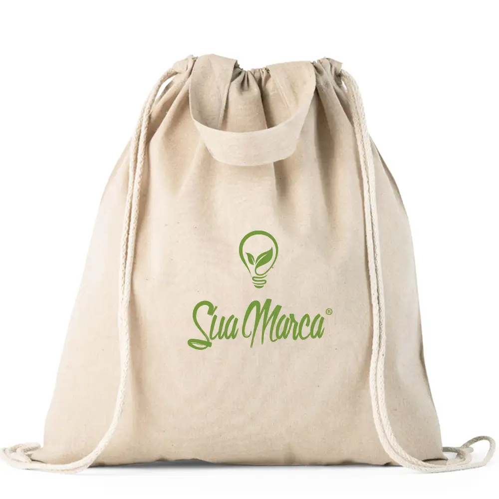 Sacola tipo mochila ecologica personalizada fabricada com 70 por cento algodao reciclado e 30 por cento poliester reciclado com gramatura de 140g por metro quadrado. Possui alcas de 30 cm oferecendo praticidade no transporte. O tecido e natural sem tingimento preservando sua cor original e evitando o uso de produtos quimicos reduzindo o impacto ambiental. Dimensoes de 370 por 410 mm ideal para brindes eventos e uso diario com estilo e sustentabilidade.