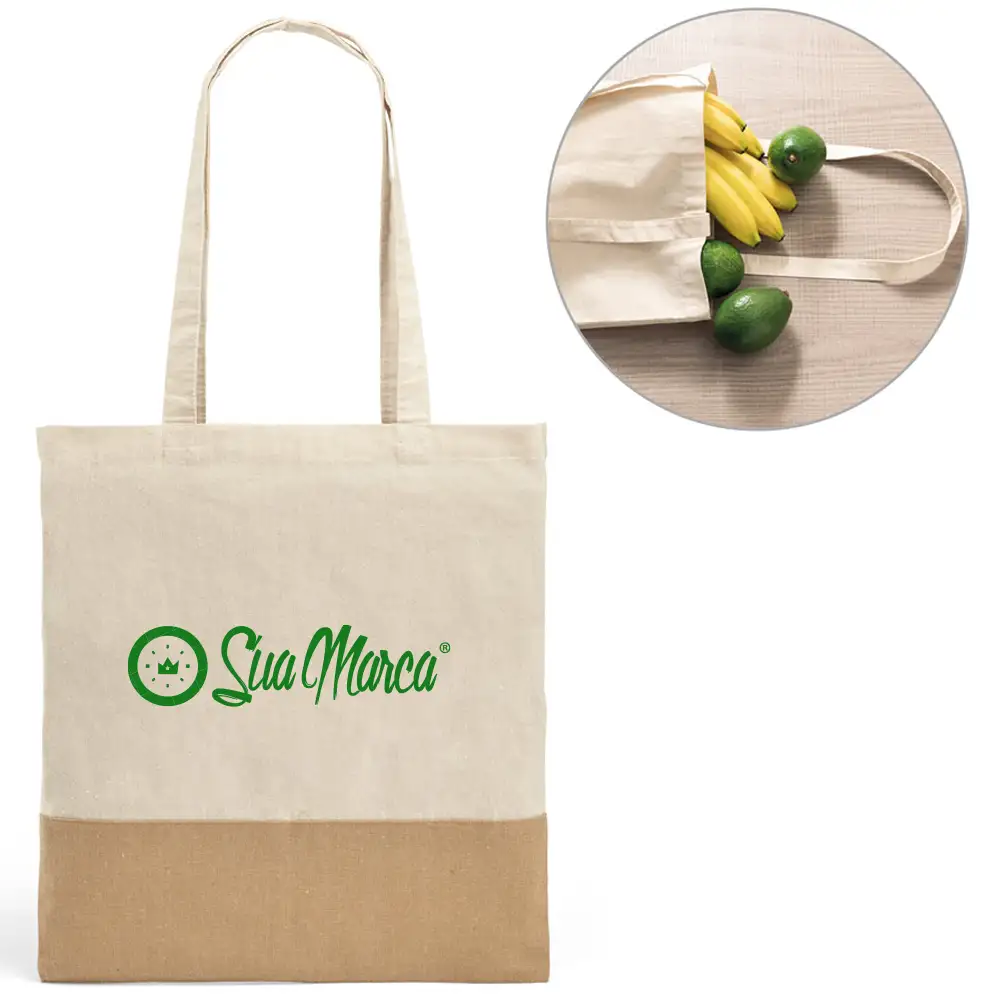 Sacola ecológica personalizada confeccionada em algodão puro de alta qualidade resistente e durável design sofisticado com detalhe exclusivo em imitação de juta alças reforçadas de 65 cm para conforto e praticidade amplo espaço interno ideal para compras, eventos brindes e uso diário tamanho perfeito de 375 x 415 mm ecologicamente correta reutilizável e sustentável escolha inteligente para quem valoriza estilo e meio ambiente.