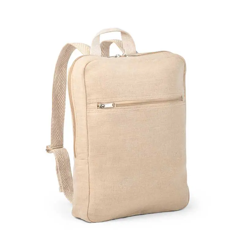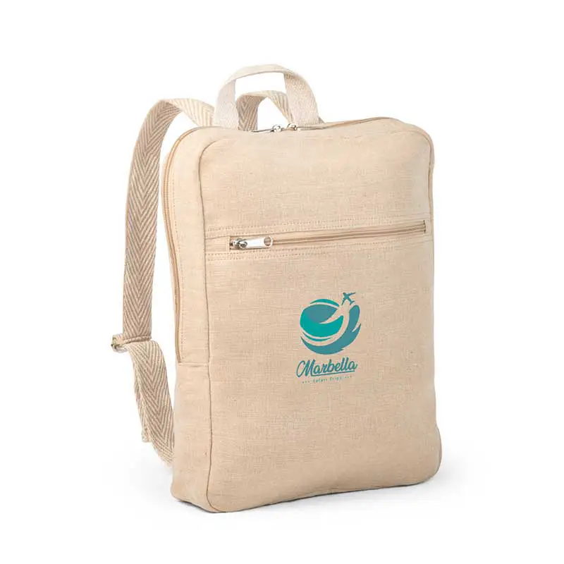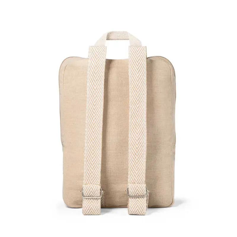 Mochila em juco (275 g/m²) com um compartimento principal e bolso frontal com fecho. Pega em webbing de algodão no topo e alças ajustáveis em algodão bicolor. 270 x 350 x 70 mm