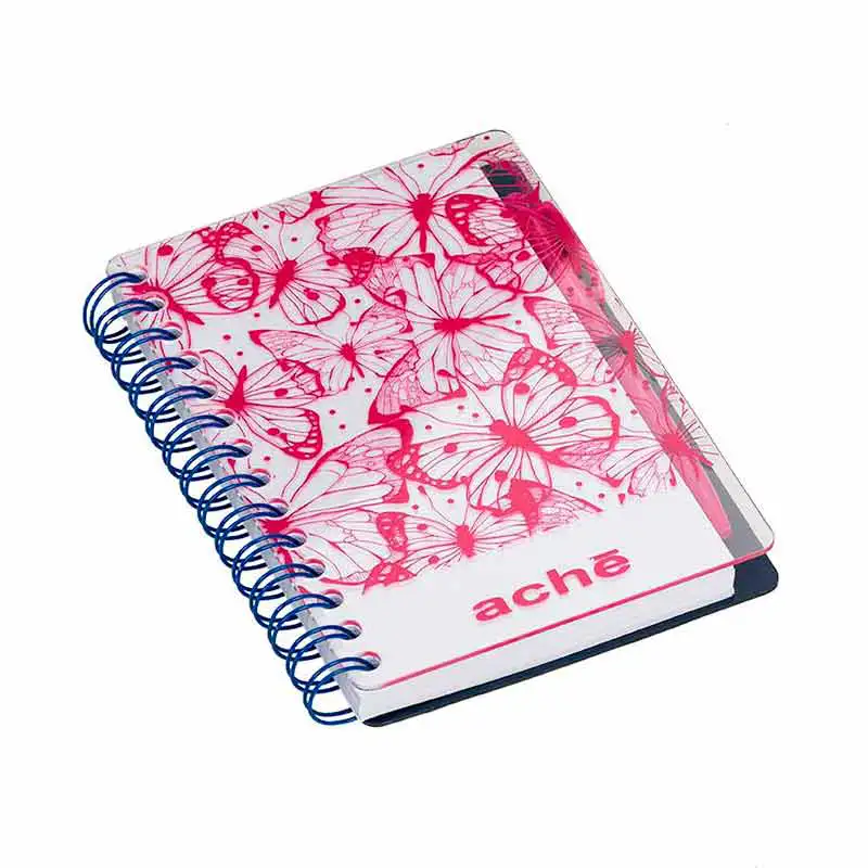 Capa: 100 x 145 mm capa e Contra capa de Acrílico 100 folhas Papel off-set, acabamento em Wire-o Fornecido: Em embalagem individual caixa de papel cartão triplex 300g (Branca). Opcionais: miolo personalizado Miolo papel reciclato.