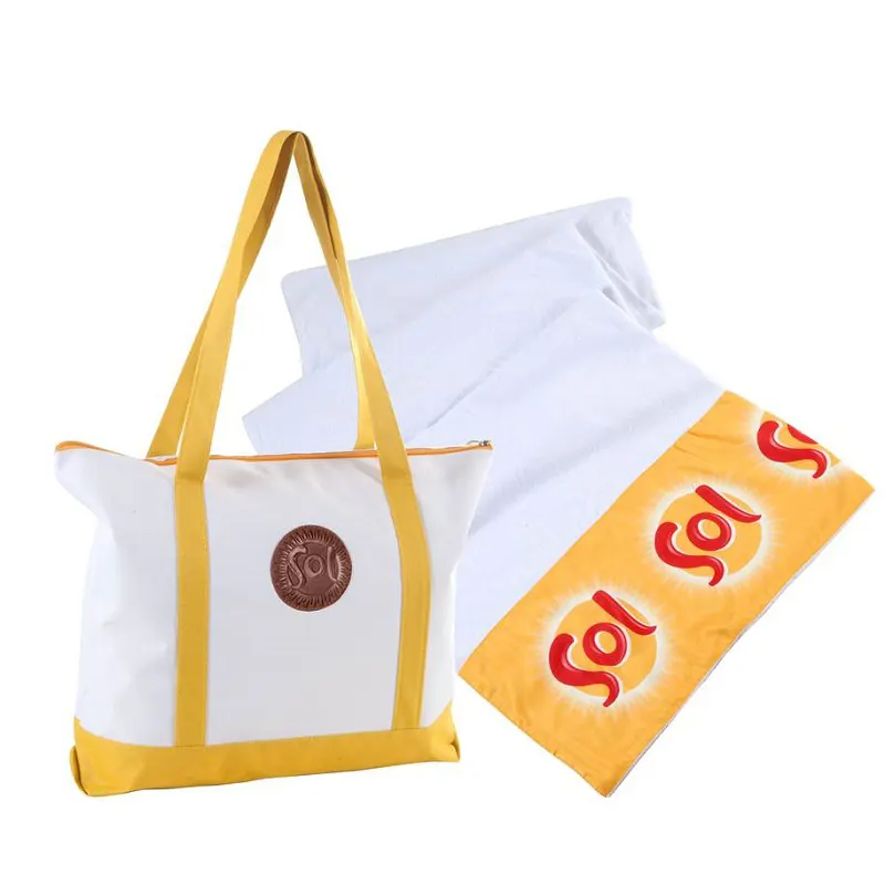KIT PRAIA TOALHA COM BARRADO E BOLSA