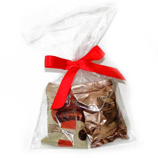 O kit contém: 1 Trufa 40G, 1 Alfajor Baunilha 25g + Saco para presente transparente e fita de cetim de 15mm.