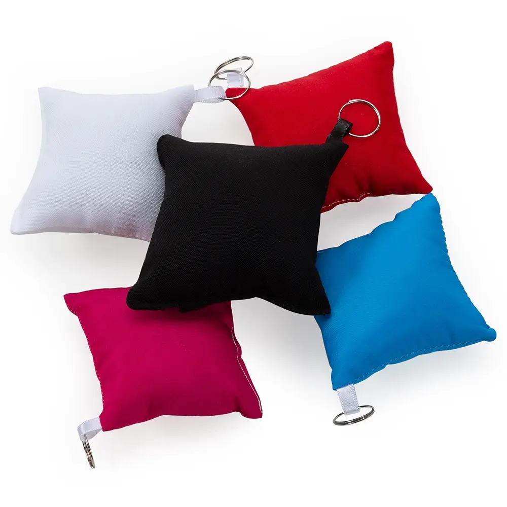 Chaveiro almofada confeccionado em tecido de microfibra, enchimento de espuma de silicone com alça de cetim e argola.